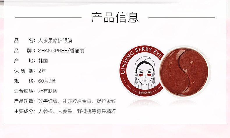 【国内现货】SHANGPREE香蒲丽人参果修复眼膜60片 韩国红公主去细纹抗皱紧致【包邮】